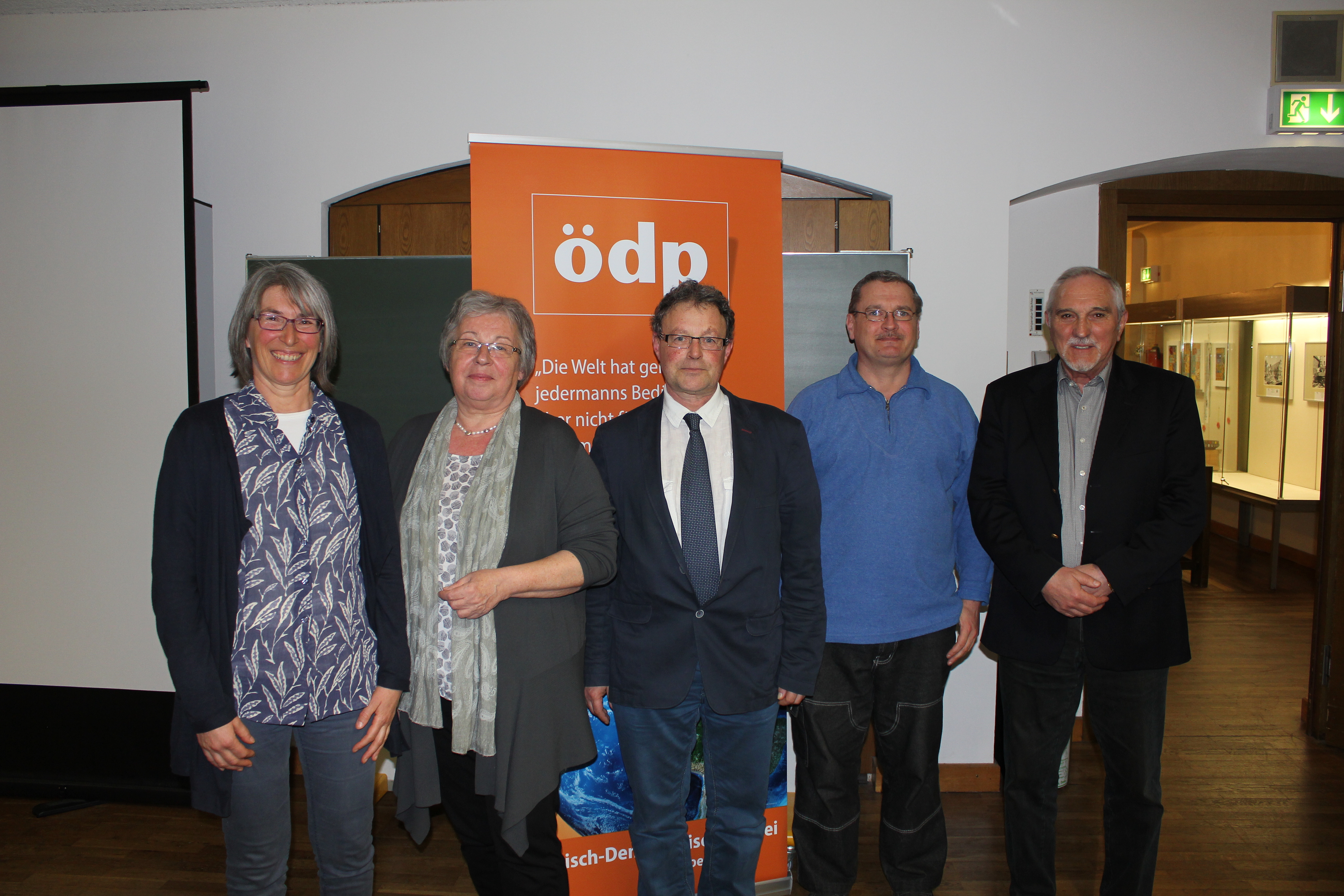 Constanze Tucher von Simmelsdorf, Kreisvorsitzende ÖDP Aichach-Friedberg, Bundes-Direktkandidatin des Wahlkreises Augsburg-Land; Gabriela Schimmer-Göresz, Bundesvorsitzende ÖDP und Spitzenkandidatin Bayern; Kurt Rieder, Kreisvorsitzender ÖDP Aachen, Bundesarbeitskreis „humanökologisches Grundeinkommen“; Robert Huemer, Direktkandidat ÖDP des Wahlkreises Augsburg-Stadt; Manfred Link, Ortsvorsitzender ÖDP Gersthofen, Bundesarbeitskreis „humanökologisches Grundeinkommen