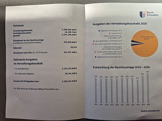 Ich möchte mich aufrichtig bei allen Bediensteten des Bezirks Schwaben für ihr unermüdliches Engagement und die geleistete Arbeit im vergangenen Jahr bedanken. Herzlichen Dank an jeden Einzelnen von Ihnen. Wie bereits im Vorjahr bleibt das Thema Finanzen das zentrale Feld unserer gemeinsamen Arbeit der kommunalen Familie. Die Herausforderungen im Haushaltsjahr 2025/2026 bleiben hoch. Bereits das dritte Jahr in Folge fehlen dem Bezirk Schwaben rund 90 Millionen, um einen ausgeglichenen Haushalt zu gestalten. Im Jahr 2024 wurden die Rücklagen aufgebraucht. 2025 konnte der Haushalt nur dank der Kassenkreditaufnahme ausgeglichen werden. Die Aussichten für 2026 zeigen, dass die großen Steigerungen der FAG-Umlage, die vom Freistaat Bayern beigesteuert werden, nur etwa die Hälfte dessen abdecken, was eigentlich benötigt würde.